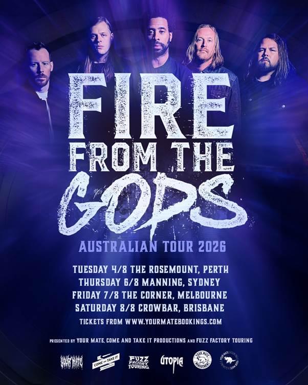 US heavy hitters FIRE FROM THE GODS have officially announced their long-awaited debut Australian tour, set to ignite stages this August 2026 in Brisbane, Melbourne, Perth & Sydney